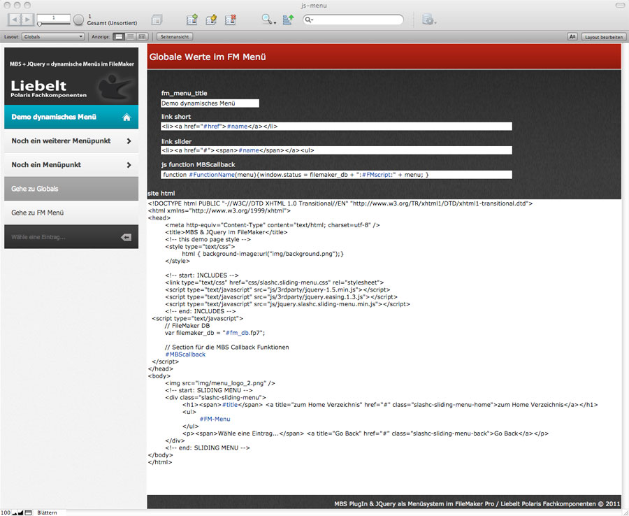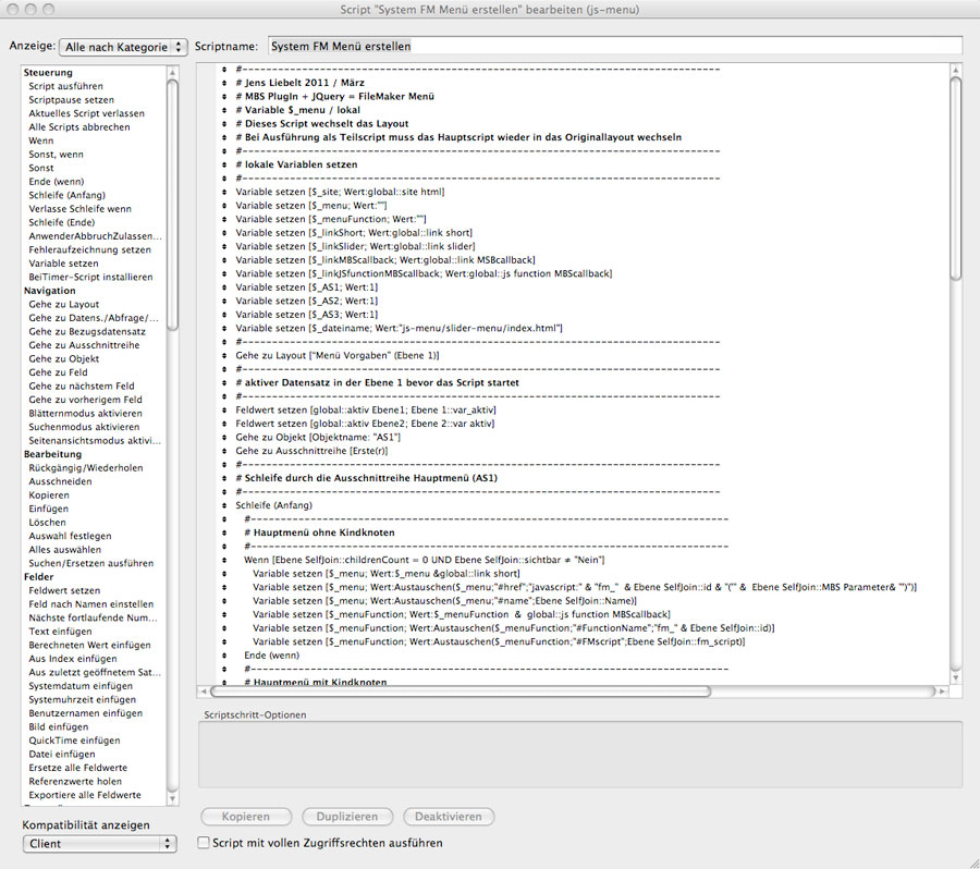 Das FileMaker Script erstellt die Liste (UL/LI) und die JavaScripte für das Callback zum FileMaker. Ich habe bereits berücksichtigt das Menüpunkte ausgeblendet werden können. Die individuelle Sortierung der Menüpunkte wird ebenfalls berücksichtigt.