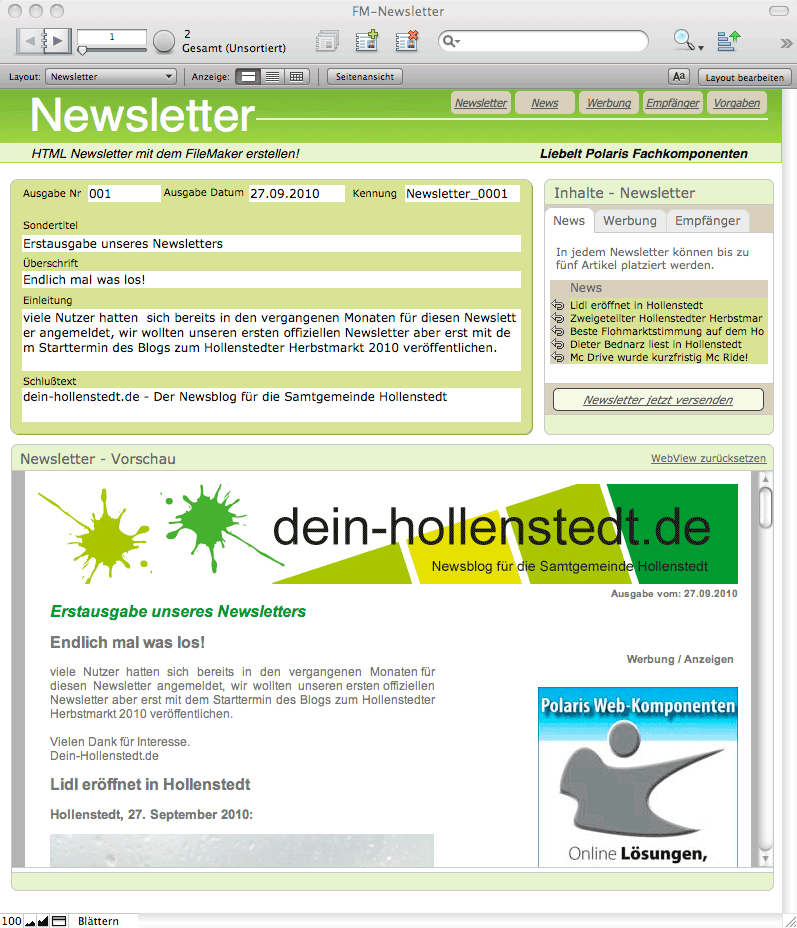 Die News-Artikel werden in einem eigenen Layout erfasst bzw. geschrieben. Der News-Artikel, der in diesem Beispiel verwendet wurde besteht aus den Inhalten eines Artikels aus dem WebBlog dein-hollenstedt. Die Inhalte wurden aus dem Browser kopiert und in die FileMaker Datenbank eingefügt. Auf diese Art wurden sowohl der Text, wie auch die Links (Browser Kontext-Menü / Link kopieren) und die Bilder (Browser Kontext-Menü / Bildadresse kopieren) eingefügt. Das System lässt sich für den Kunden auch so anpassen, dass die Artikel optional aus einer Webdatenbank direkt eingelesen werden. Über das Feld Websource lassen sich alle belieben Internetdienste in den Newsletter einbinden, wir benutzen das Feld meistens für YouTube Videos oder Audio Dateien.