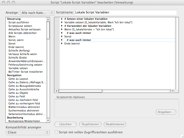 In FileMaker Pro werden die lokalen Variablen mit dem Scriptbefehl VariableSetzen angelegt. Die lokale Variable beginnt im mit einem einfachen $ Zeichen. Die Gültigkeit der lokalen Variable ist auf das aktuelle Script beschränkt. Man kann also den gleichen Variablennamen in einem anderen Script verwenden, ohne das es zu Konflikten zwischen den Scripten kommen kann.